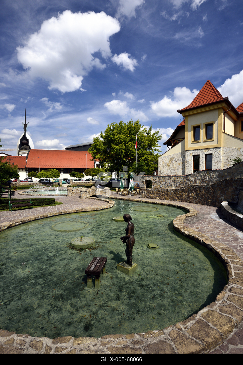 Sétautak tavak, csobogók, szobrok, virágok a Dr. Agyagási Dezső gyógyparkban.
