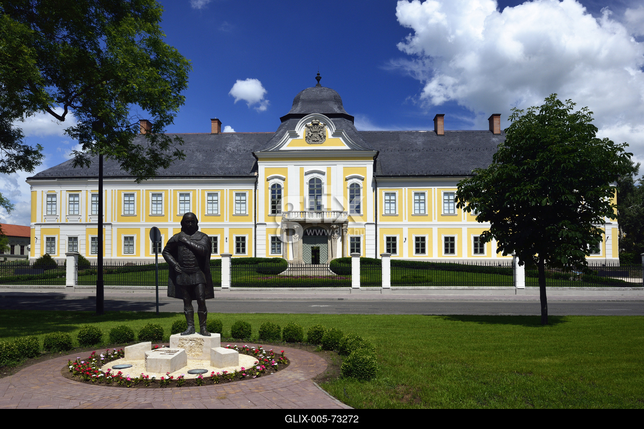 A hatvani Grassalkovich-kastély copf stílusba hajló, késő barokk épülete. Előtérben a Grassalkovich Antal-szobor.