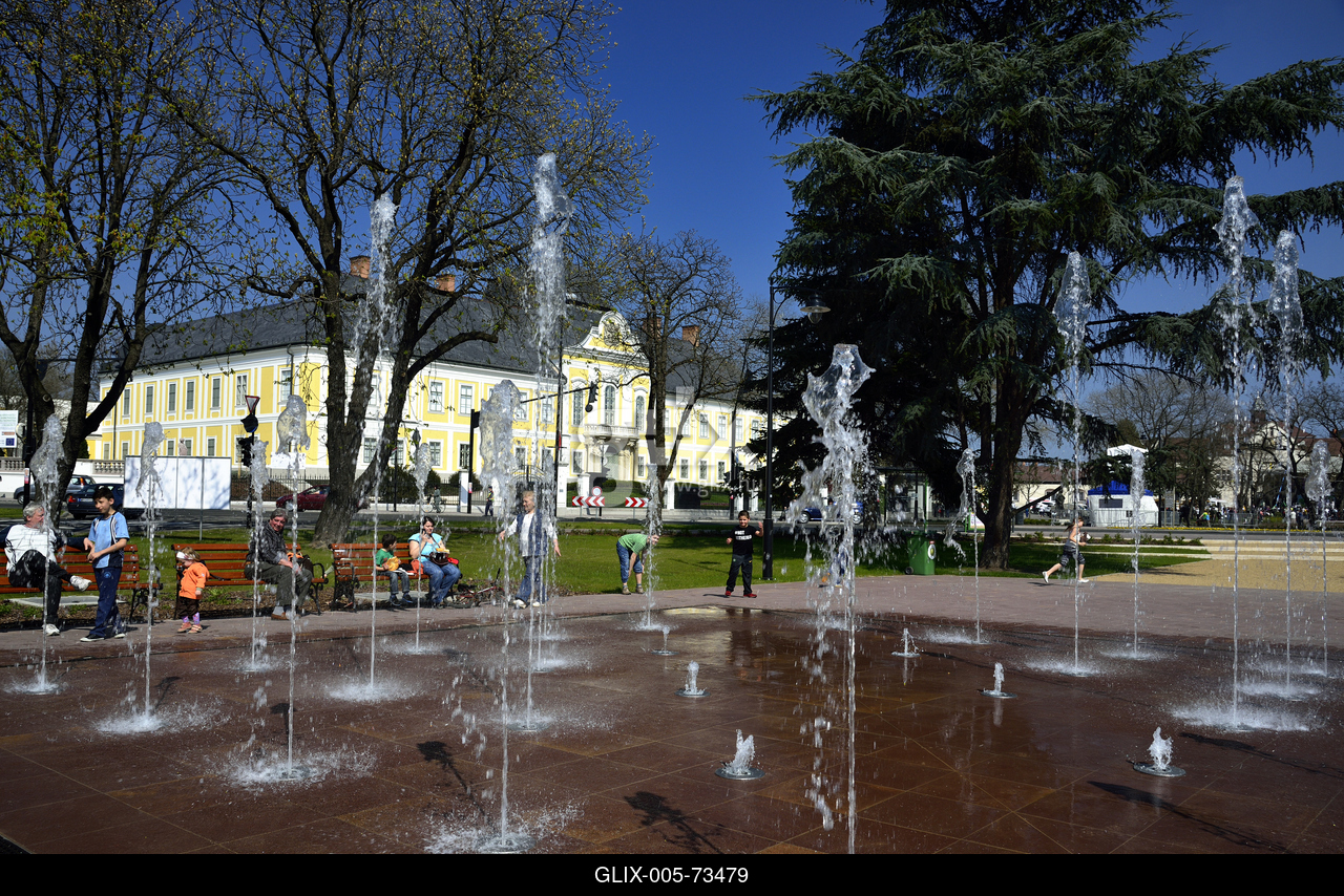 Hatvan főtere, háttérben a Grassalkovich-kastély copf stílusba hajló, késő barokk épülete.