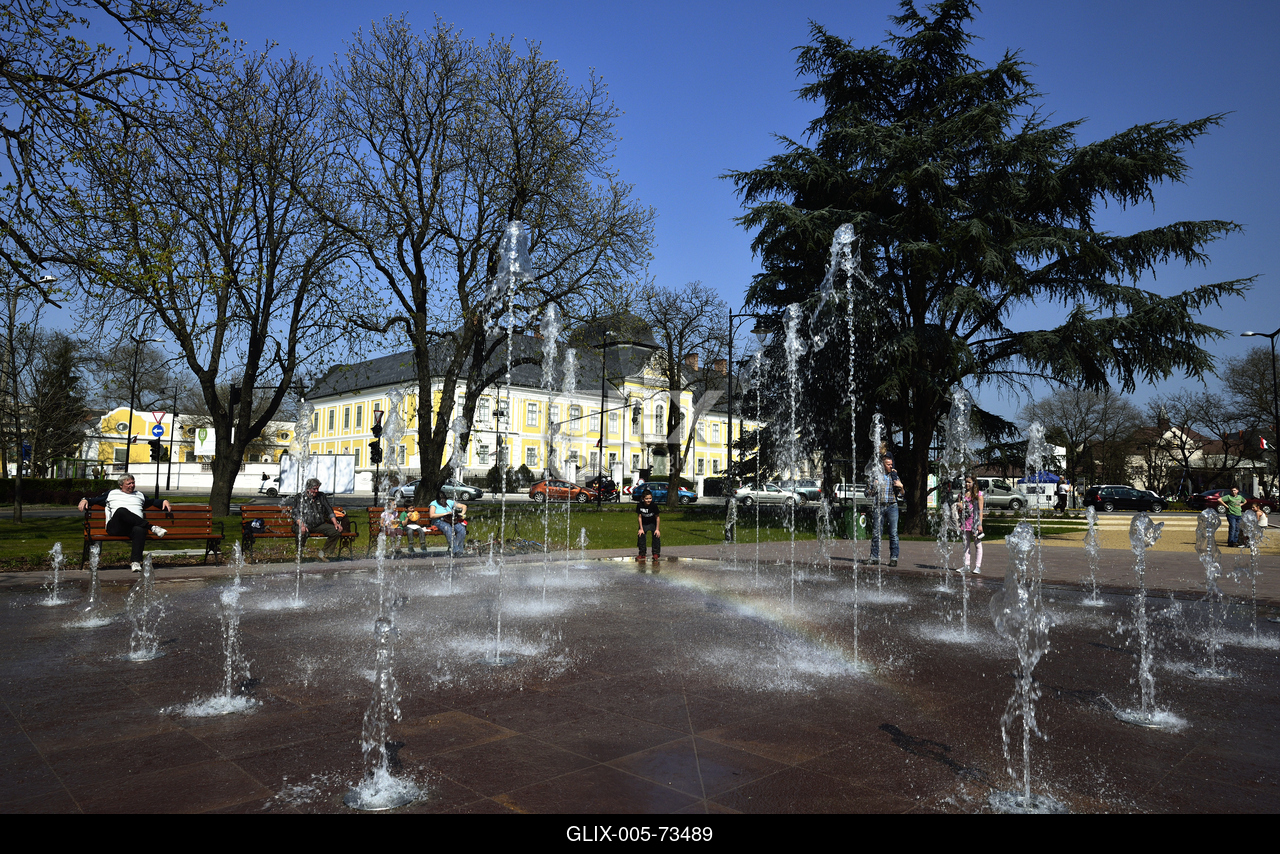 Hatvan főtere, háttérben a Grassalkovich-kastély copf stílusba hajló, késő barokk épülete.
