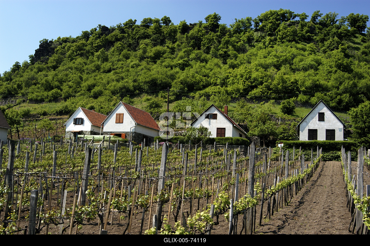 Présházak és szőlőültetvények a Somló-hegyen.