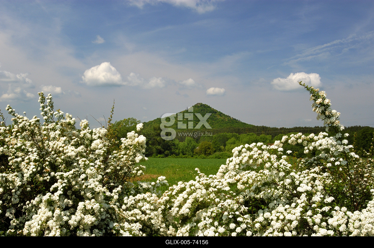 Balaton-felvidéki táj háttérben a Hegyesd község fölé magasodó kúp alakú hegy.