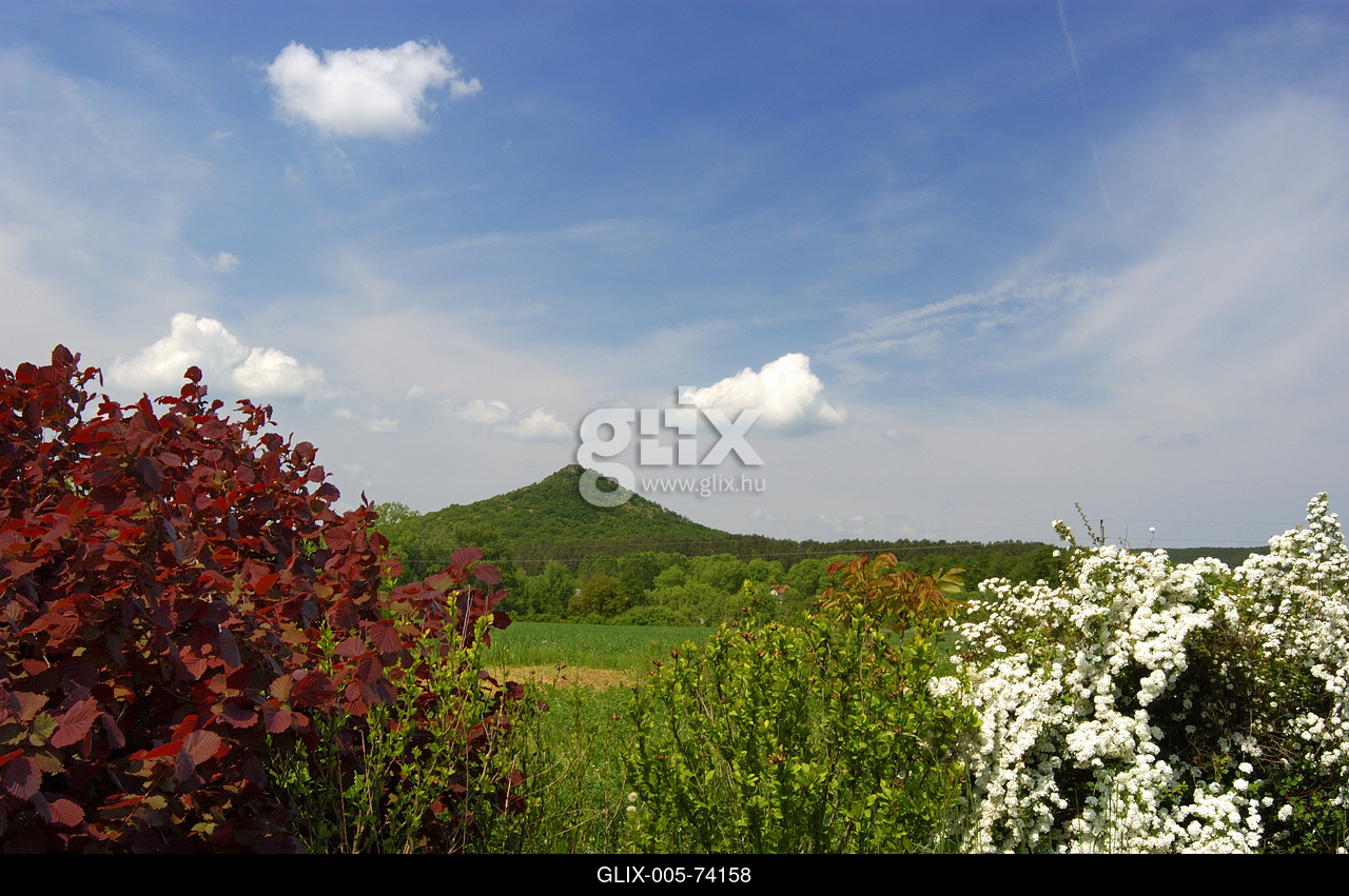 Balaton-felvidéki táj háttérben a Hegyesd község fölé magasodó kúp alakú hegy.