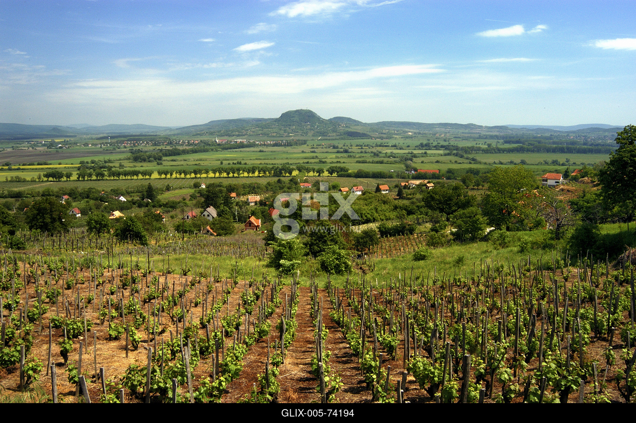A Balaton-felvidék tanúhegyeinek látványa a Szent György-hegyről.