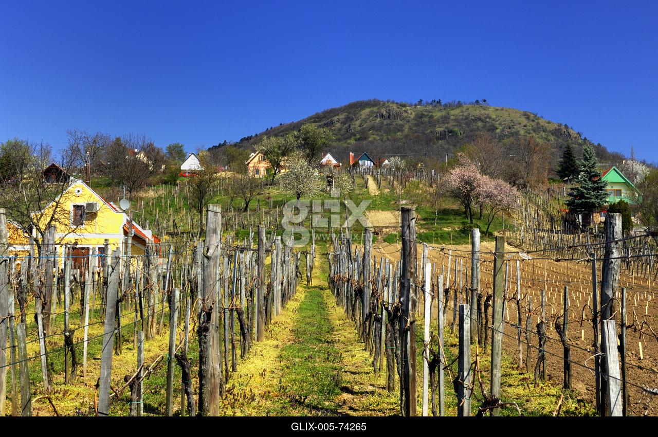 Virágzó gyümölcsfák a Szent György-hegyen. A Szent György-hegy a Balaton-felvidék másik legjelentősebb tanúhegye, oldalán hatalmas bazaltoszlopok találhatók.