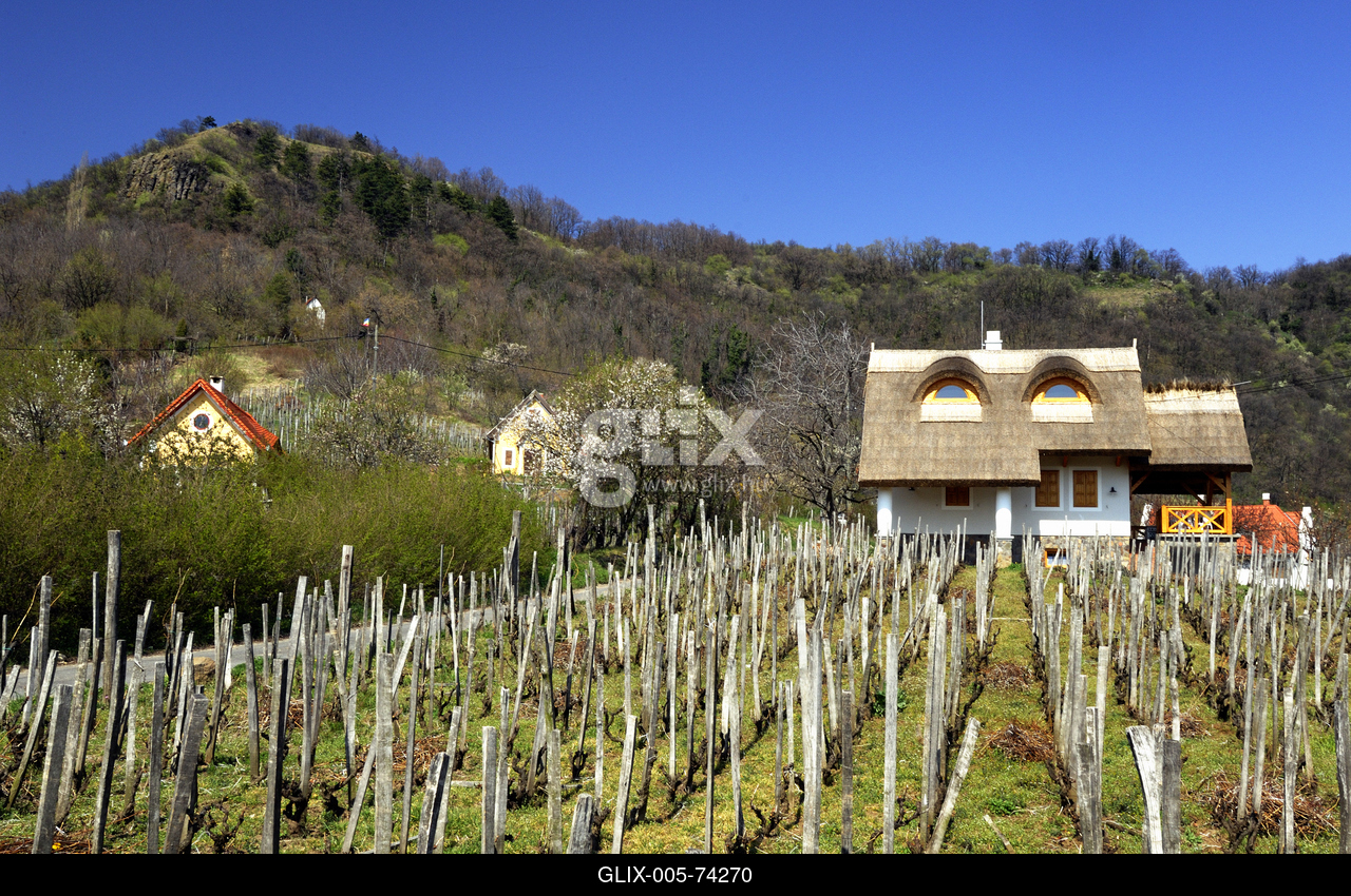 Virágzó gyümölcsfák a Szent György-hegyen. A Szent György-hegy a Balaton-felvidék másik legjelentősebb tanúhegye, oldalán hatalmas bazaltoszlopok találhatók.