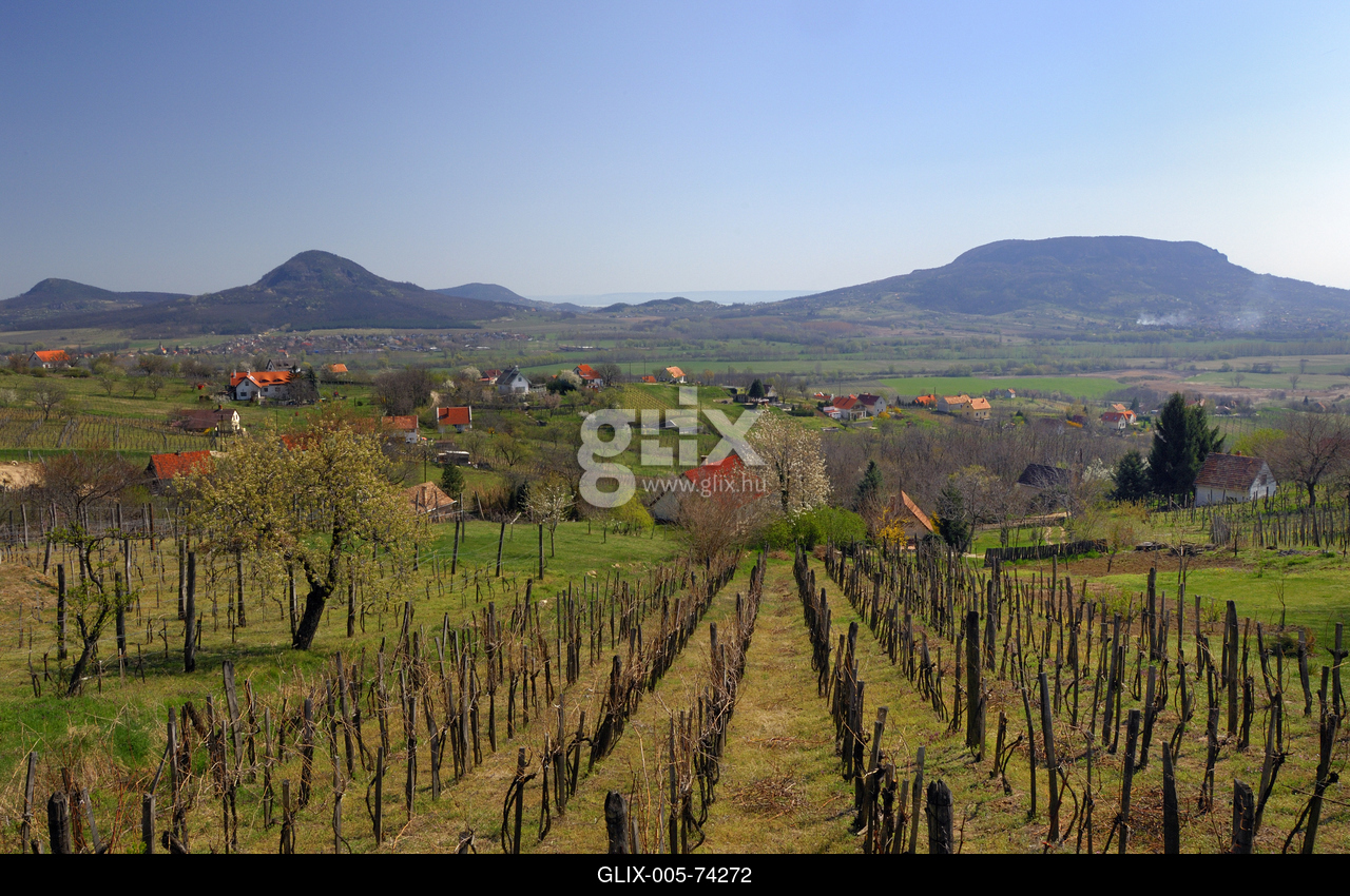 Virágzó gyümölcsfák a Szent György-hegyen. A Szent György-hegy a Balaton-felvidék másik legjelentősebb tanúhegye, oldalán hatalmas bazaltoszlopok találhatók.