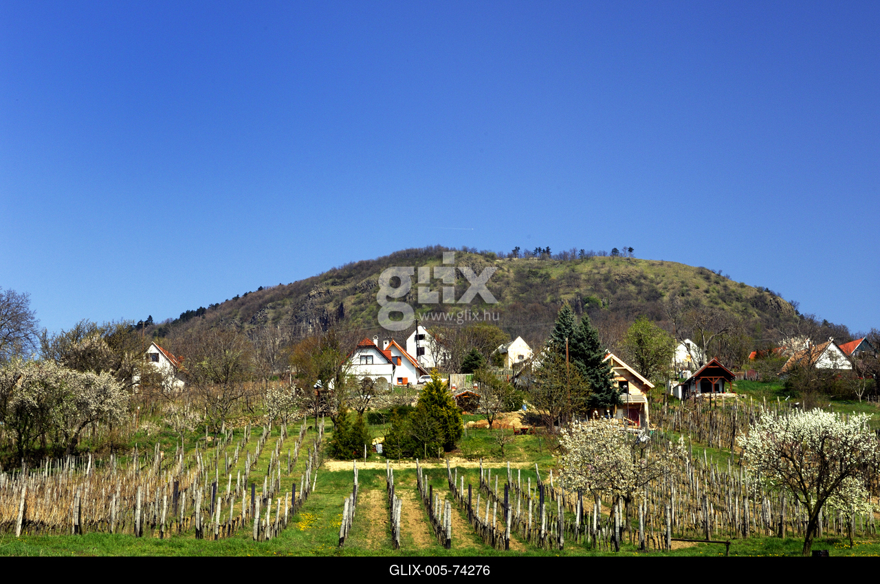 Virágzó gyümölcsfák a Szent György-hegyen. A Szent György-hegy a Balaton-felvidék másik legjelentősebb tanúhegye, oldalán hatalmas bazaltoszlopok találhatók.