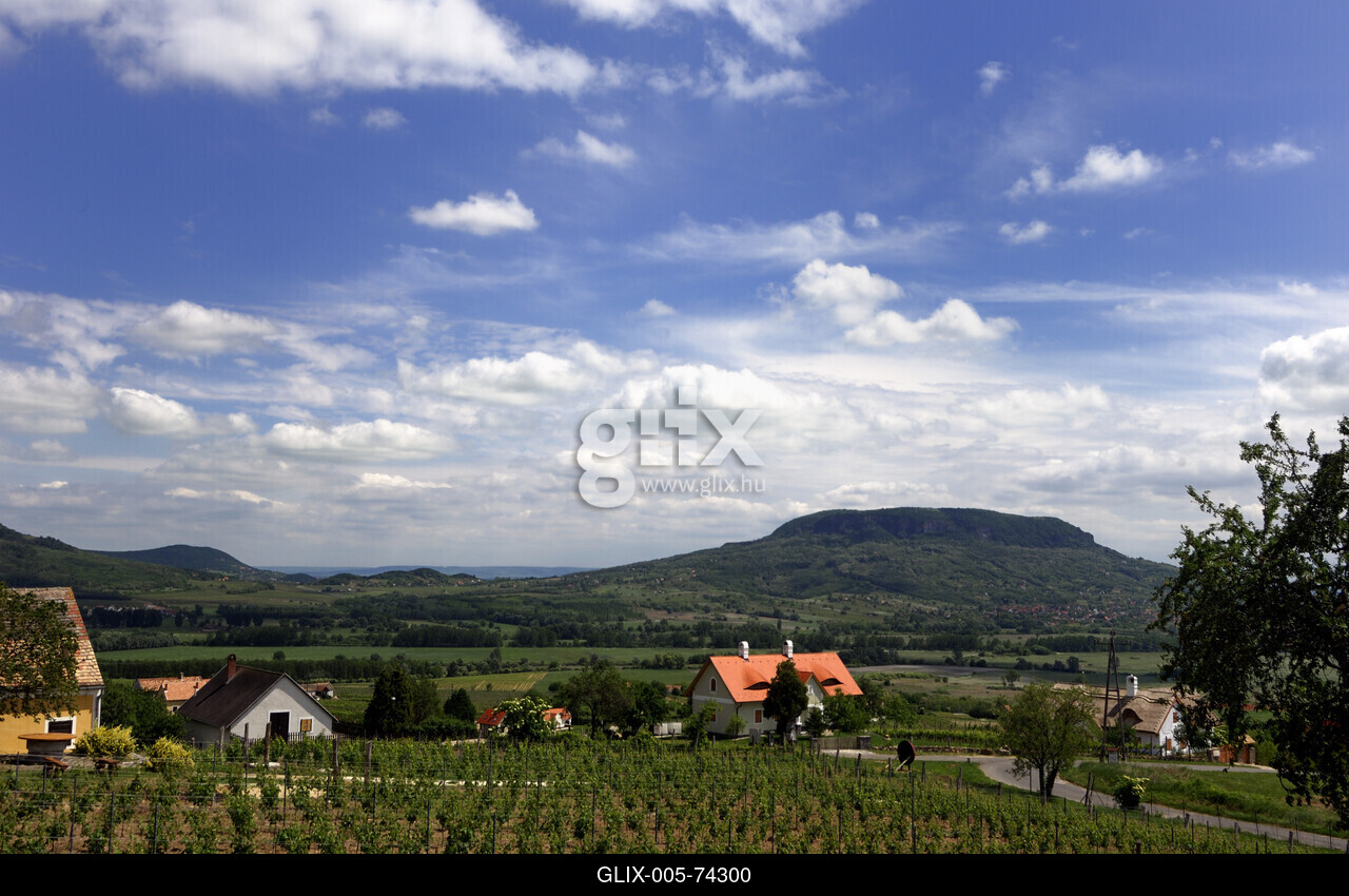A Balaton-felvidék tanúhegyeinek látványa a Szent György-hegyről.