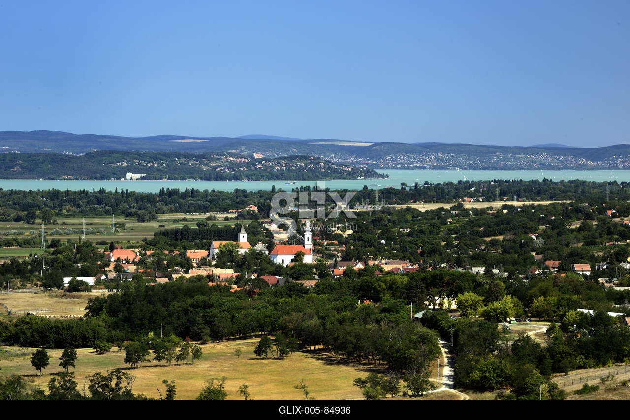 Kőröshegy látképe a Kőröshegyi völgyhídról. Háttérben a Balaton és a Tihanyi-félsziget.
