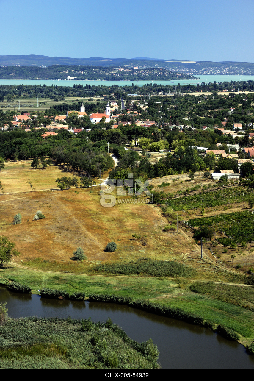 Kőröshegy látképe a Kőröshegyi völgyhídról. Előtérben a Kőröshegyi-horgásztó, háttérben a Balaton és a Tihanyi-félsziget.