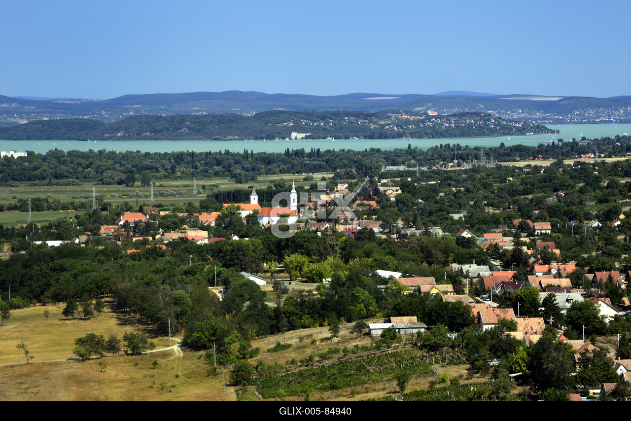 Kőröshegy látképe a Kőröshegyi völgyhídról. Háttérben a Balaton és a Tihanyi-félsziget.