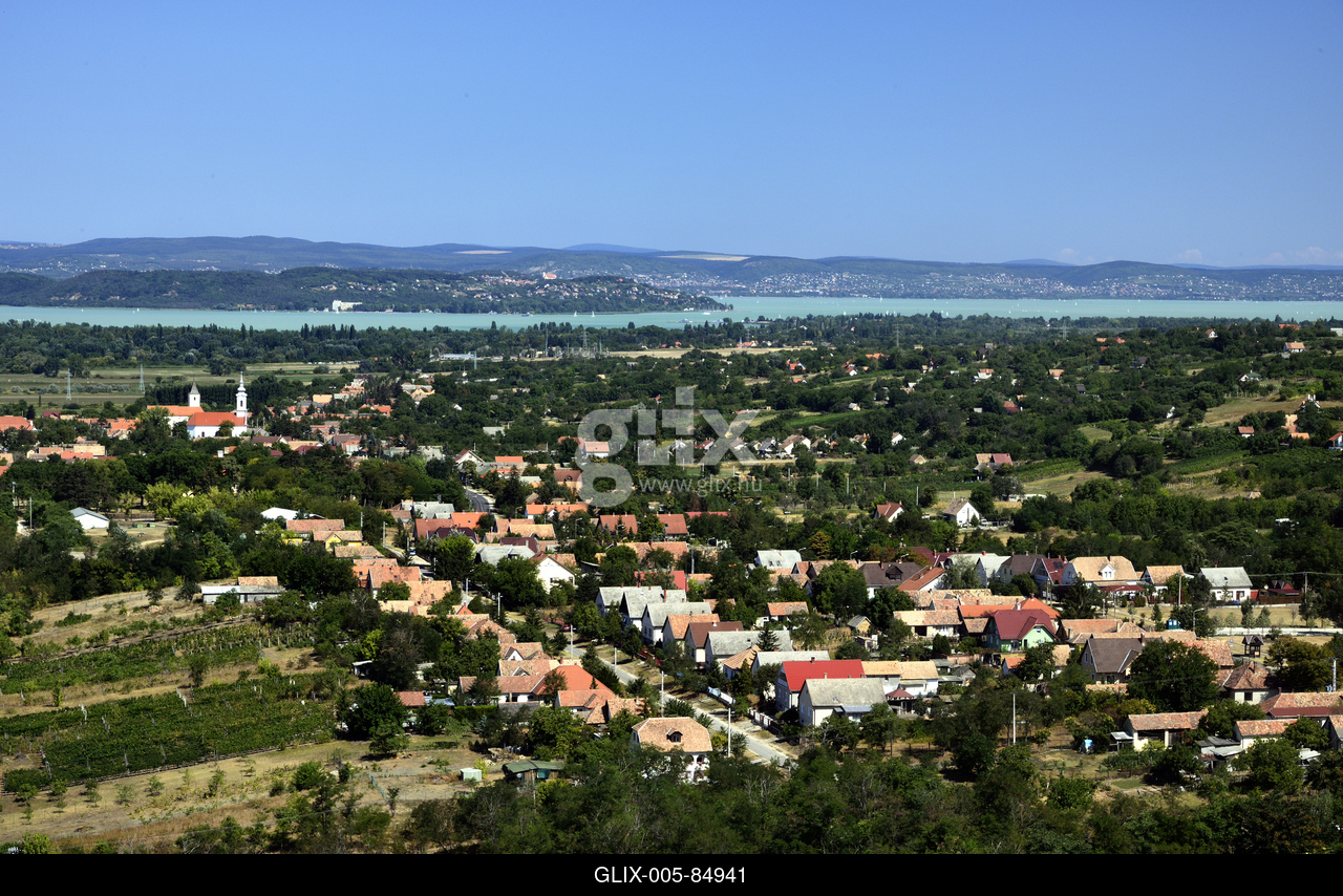 Kőröshegy látképe a Kőröshegyi völgyhídról. Háttérben a Balaton és a Tihanyi-félsziget.
