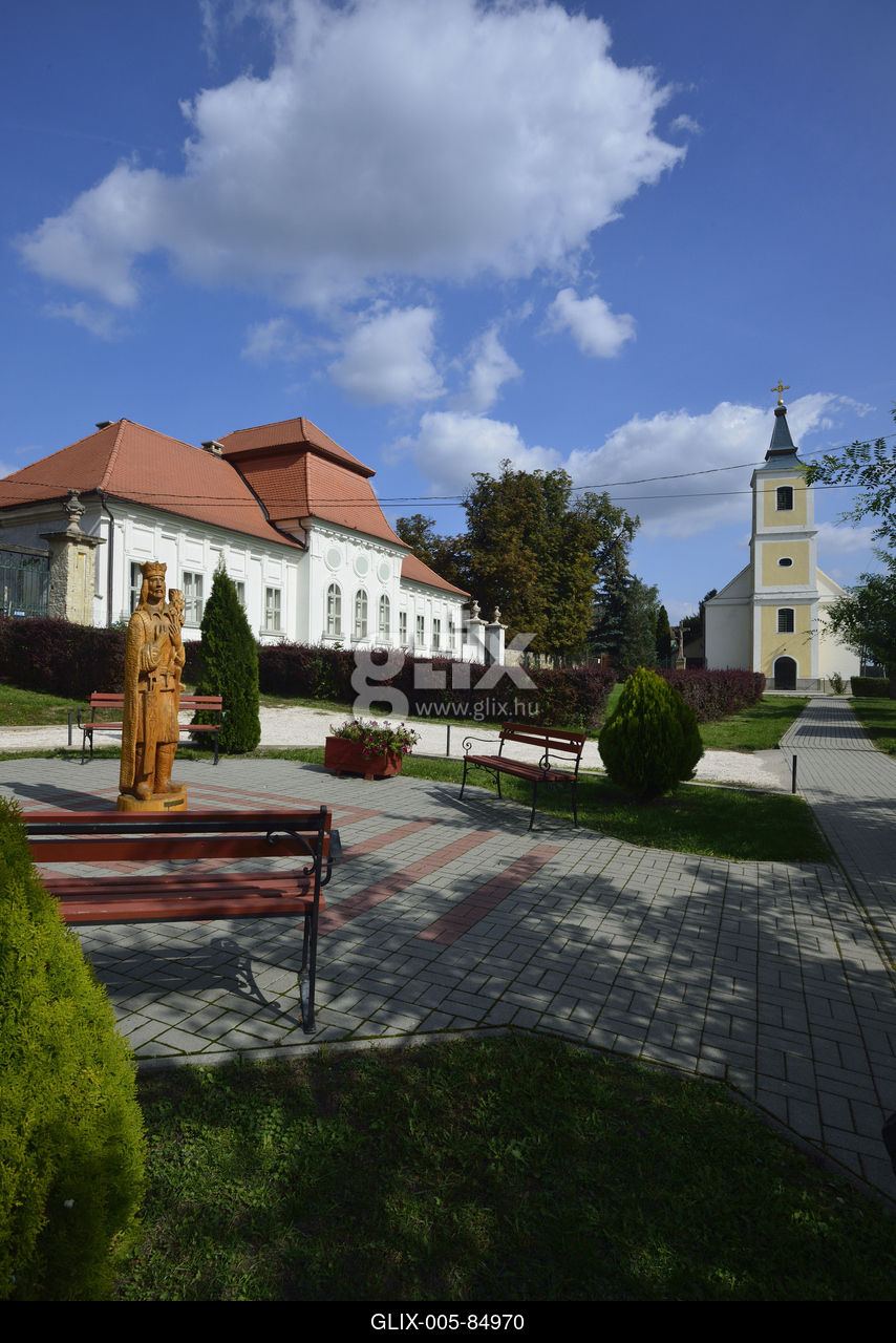 A Huszár-Purgly-kastély barokk (copf) stílusban épült, 3 épületből álló kastély, melyhez közel 2 ha-os őspark tartozik. Balra a Szent Imre szobor, a háttérben a Szent Imre római katolikus templom látható.