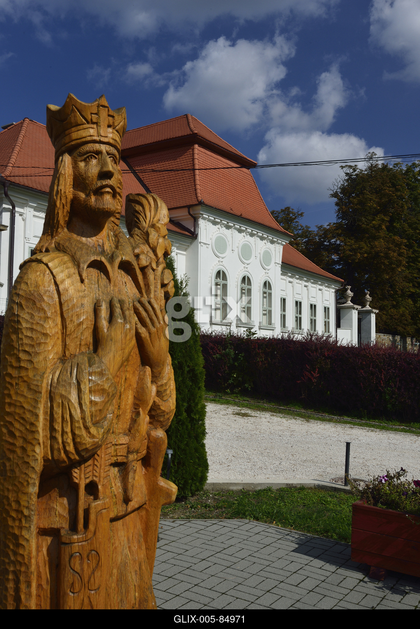 A szent imre szobor. Háttérben a Huszár-Purgly-kastély barokk (copf) stílusban épült, 3 épületből álló kastély, melyhez közel 2 ha-os őspark tartozik.