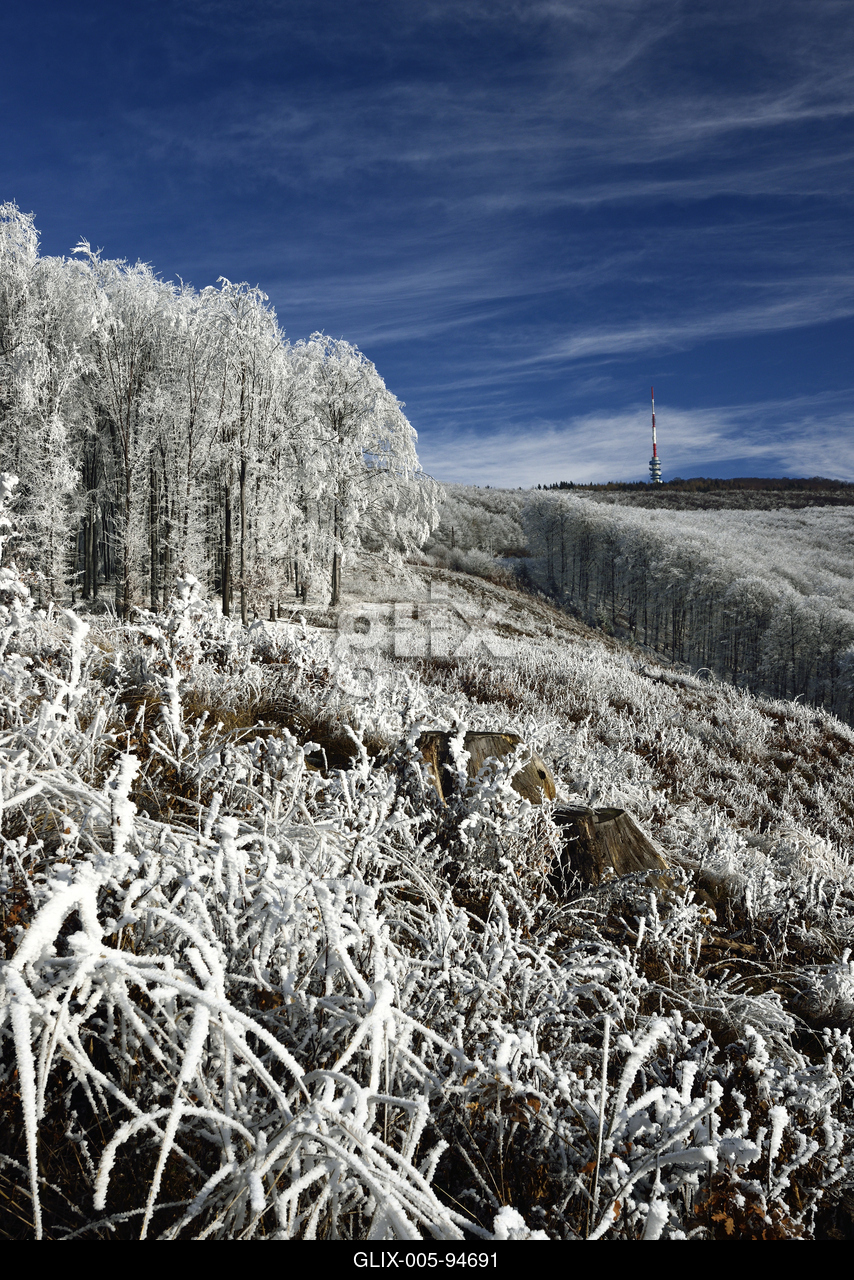 Zúzmarás, havas téli táj a Mátrában, Kékestető közelében.