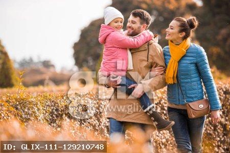 Happy family with one child walking in beautiful autumn park