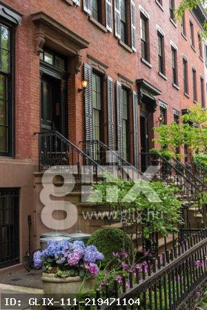 Row of old brownstone buildings along an empty sidewalk block in the Greenwich Village neighborhood of Manhattan, New York City, NYC, USA.