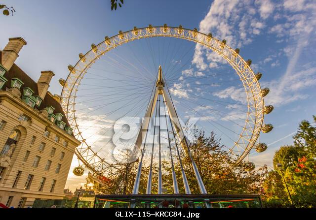 The London Eye in London's Westminster viewed from the south bank of the River Thames, during sunset.