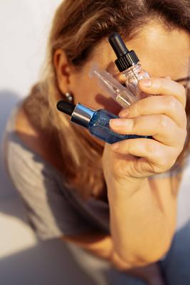 Image of young blond woman, girl records video about makeup, shows skin tone beauty products, sits in a room on floor Im-stock-foto