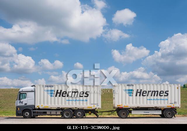 A Hermes lorry in fine weather in Zons, blue sky and white clouds form the backdrop for delivery traffic in the Rhineland.